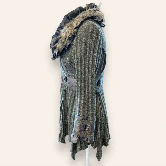 Nicole Sabbattini Boho Luxe Charcoal Sweater Coat with Faux Fur & Satin Ruffle Trim – Women’s Small